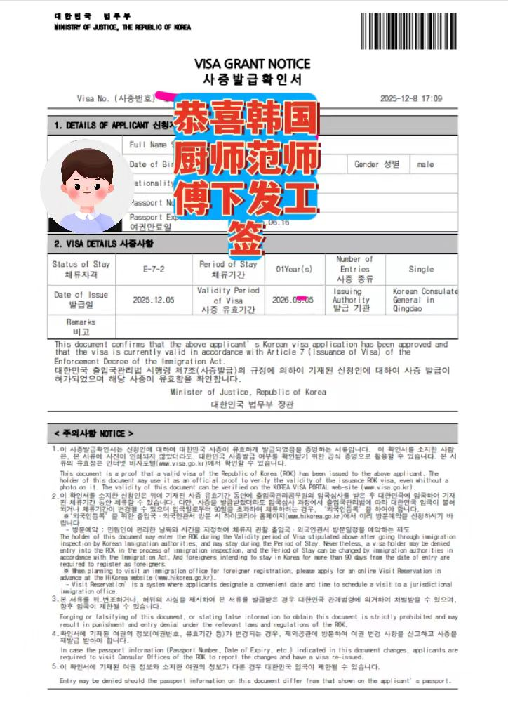 恭喜范師傅韓國廚師工作簽證成功下發!歷經材料審核、雇主匹配、領館審批等全流程,正規廚師簽證順利到手,即將開啟赴韓高薪工作之旅~